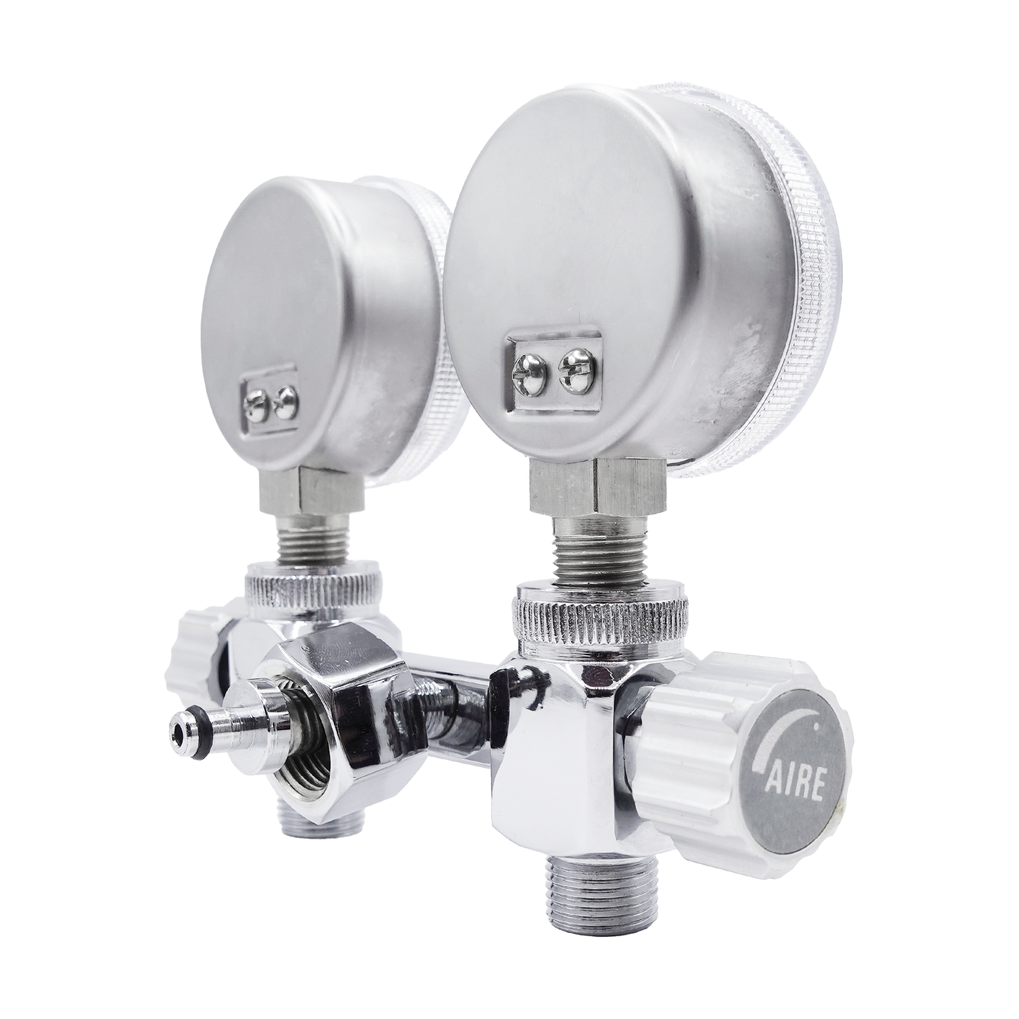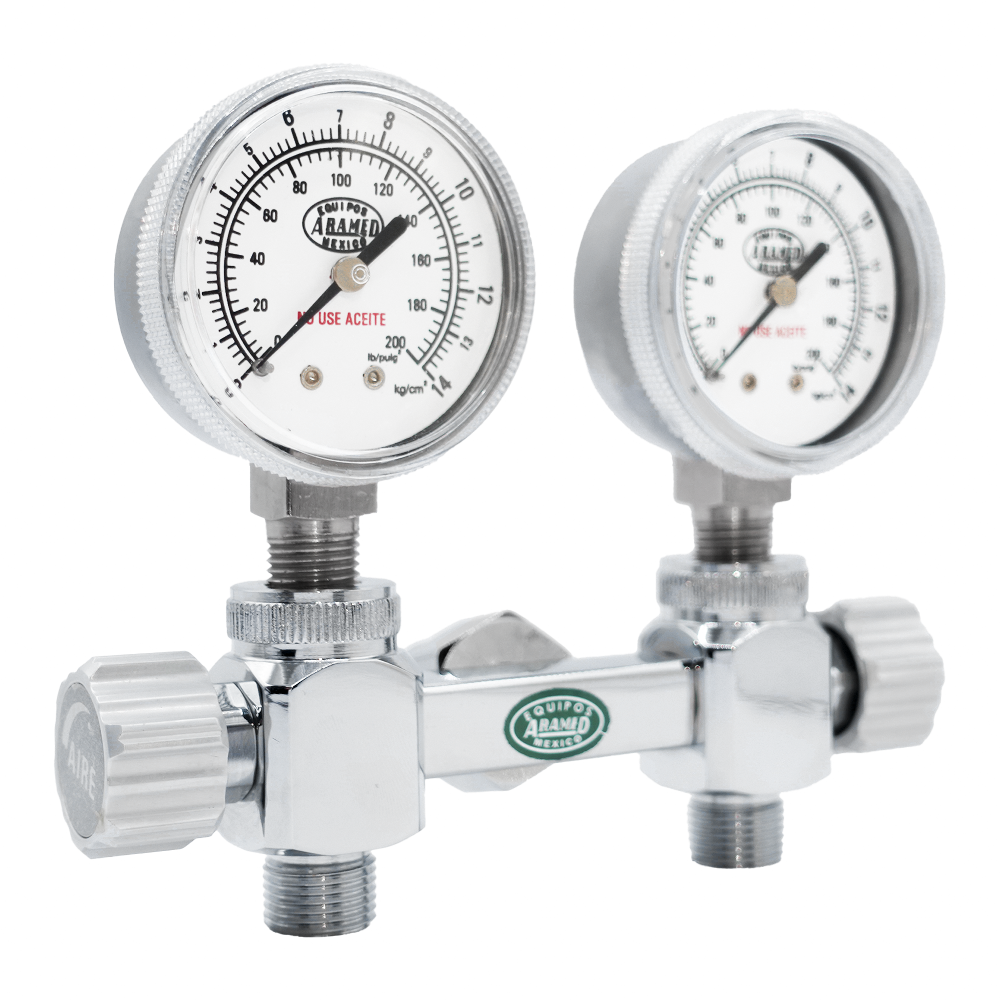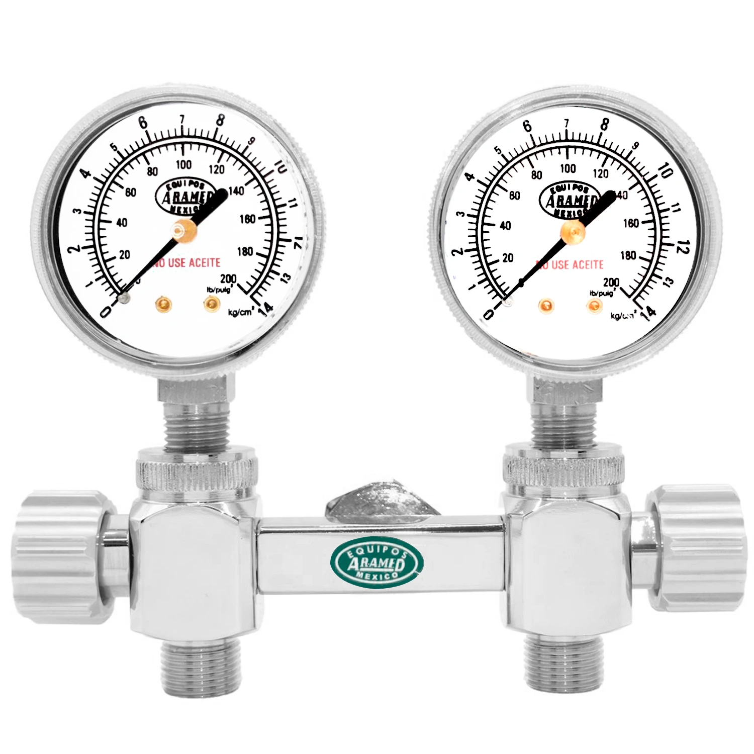 Su estructura en latón cromado y níquel de alta pureza proporciona resistencia a la corrosión, durabilidad y un sellado hermético frente a fugas. Gracias a sus dos manómetros de precisión (0–14 kg/cm²), permite monitorear y ajustar la presión de salida de manera independiente, brindando un control preciso en cada conexión.